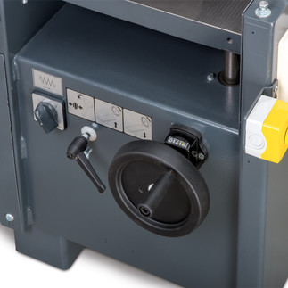 The design of the machine has comfortable guidance of the workpiece on solid cast iron tables with high robustness and precision.A significant design change compared to the previous model is especially the comfortable parallel tilting of the tables on massive hinges. Two torque springs facilitate the manipulation of the tables. The machine is equipped with a spiral cutter system MBM. It is not possible to purchase a mortiser for this machine.